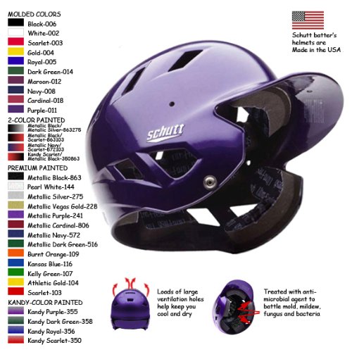 Schutt AiR-5 Baseball/Softball Batting Helmet All Schutt helmets exceed NOCSAE Standards - Premium fitted helmet with a high impact, durable ABS helmet shell - Loads of large ventilation holes help keep you cool and dry - Comfortable, dual density foam pads give you maximum protection - Treated with anti-microbial agent to battle mold, mildew, fungus and bacteria - Full anti-microbial treatment on all pads - AiR-5 is pre-drilled for batter s guards and chin strap snaps are standard Colors: Available in 10 Molded Colors and 21 Painted Colors (One or Two Colors) Adult Sizes: 2XS, XS, S, M, L, XL Manufacturer s Adult Size ChartSIZE 2XS XS S M L XL HAT SIZE 6 3/8-6 1/2 6 5/8-6 3/4 6 7/8-7 7 1/8-7 1/4 7 3/8-7 1/2 7 5/8-7 3/4 HEAD CIRCUMFERENCE 19 1/2-20 1/2 20 3/4-21 1/4 21 1/2-22 22 1/4-22 3/4 23-23 1/2 23 3/4-24 1/4 To determine your head size, use a measuring tape to measure the circumference of your head one inch above your eyebrows. WARNING: This faceguard/helmet system cannot protect the wearer from all injuries that might occur while participating in baseball or softball. This product was specifically designed and fabricated to be mounted on a baseball/softball helmet and to be used as facial protection in the sport of baseball/softball. This product is not designed for use with any other helmet or for any other purpose. Schutt Sports disclaims any and all expressed or implied warranties, including the warranty of fitness for a particular purpose, other than as set forth herein. Due to color differences in monitors, the colors on this site are for reference only. Please contact Epic Sports if you have any color questions.