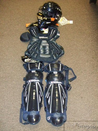 Retail value: 9.99 entire set!!You are bidding on a brand new set of Wilson MLB Pro FX baseball catchers gear. This set is brand new and has never been used!! This is the best gear on the market at a great price!! Wilson catchers gear set has the following features: Wilson MLB Pro Stock Shock FX catchers hockey style helmet:* Model: Wilson A5510.* Color: All Black.* Size: 7" - 7 5/8" L/XL.* Quad-axial impact design diffuses energy of impact in four key zones.* Floating mask reduces vibration.* Venting maximizes airflow and reduces weight.* Outlast chin liner cools players down when temperature rises.* Coolmax inner helmet liner wicks away moisture.* Panoramic cage design maximum peripheral vision.* High tensile steel mask adds strength and durability to facemask. Wilson MLB Pro Stock hinge FX chest protector:* Model: Wilson A3310.* Color: Two tone Navy/Silver.* Size: 16".* Hinge FX technology: Pre-curved and custom fit body protection.* Maximum sewn through hinges: Allow for easy movement and conforming fit.* Venting: Maximizes airflow and reduces weight.* Maximized dead ball zones: Exclusive memory foam padding minimizes rebounds.* Low rebound foam: Minimizes rebound of ball.* Dri-Lex liner: Wicks moisture away.Wilson MLB Pro Edition hinge FX leg guards:* Model: Wilson A3500.* Color: Two tone Navy/Silver.* Size: 14".* Dual hinge technology: Hinged protection system that conforms to legs.* Bridged comfort system: Three layers of foam that relieve pressure and add protection players knees and shins.* Venting: Maximizes airflow and reduces weight.* In-Lay molded padding: Unique stemmed foam on side of leg guard for added protection.* Coolmax back liner: Wicks away moisture.* Removable knee wedge: optional leg support.Check out all of our other auctions for more colors, styles and sizes!!!